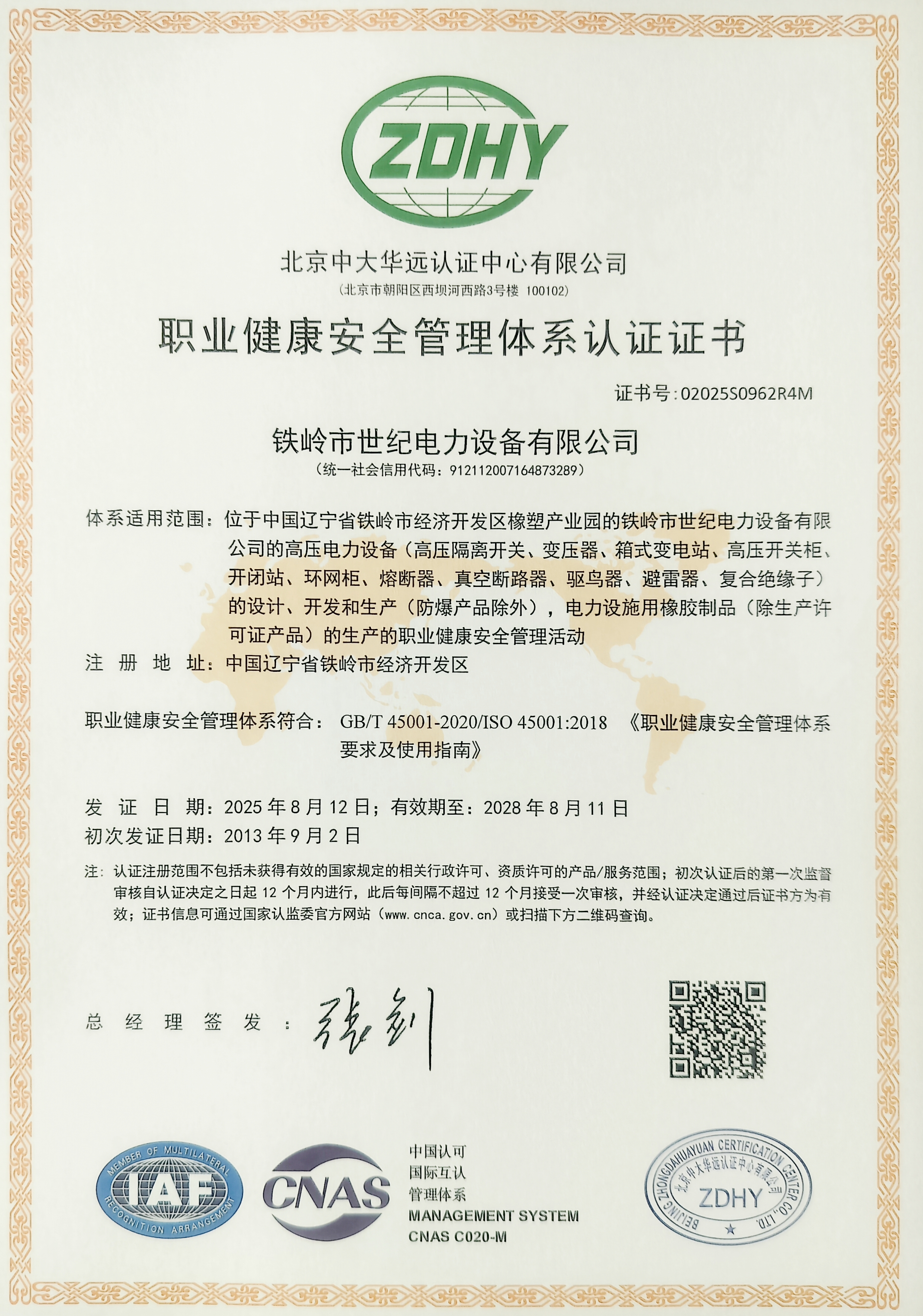 鐵嶺市世紀電力設備有限公司是集科研開發、生產制造、用戶服務于一體的國家高新技術企業,始建于1999年,位于鐵嶺經濟開發區,占地面積5萬余平方米,建筑面積2萬余平方米。主要從事國家電網配套戶外高低壓隔離開關、電力電纜、變壓器成套裝置、高低壓開關柜、箱式變電站、絕緣子等產品的研發、生產和銷售。公司現有國家發明專利6項、實用新型專利9項,公司通過了ISO9001國際質量管理體系認證、ISO14001環境管理體系認證和ISO 45001職業健康安全體系認證。